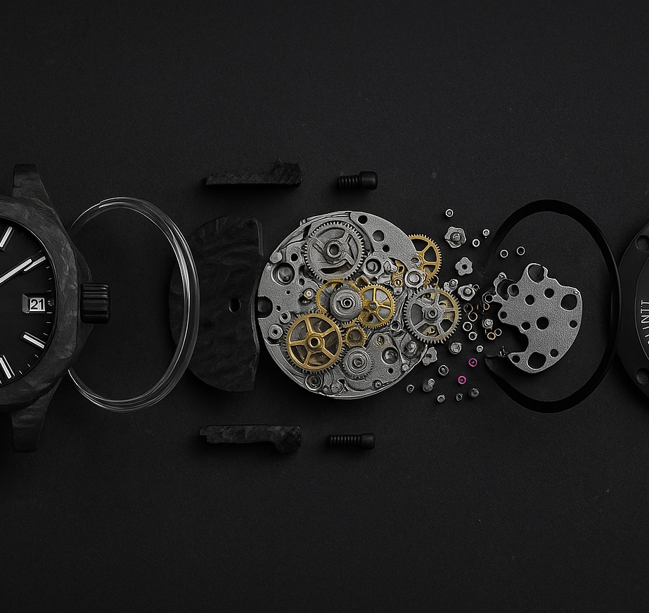Il bracciale in forged carbon, con regolazione tramite viti PVD black, garantisce comfort e solidità, mentre la corona a vite in carbonio completa un’estetica moderna e inconfondibile.