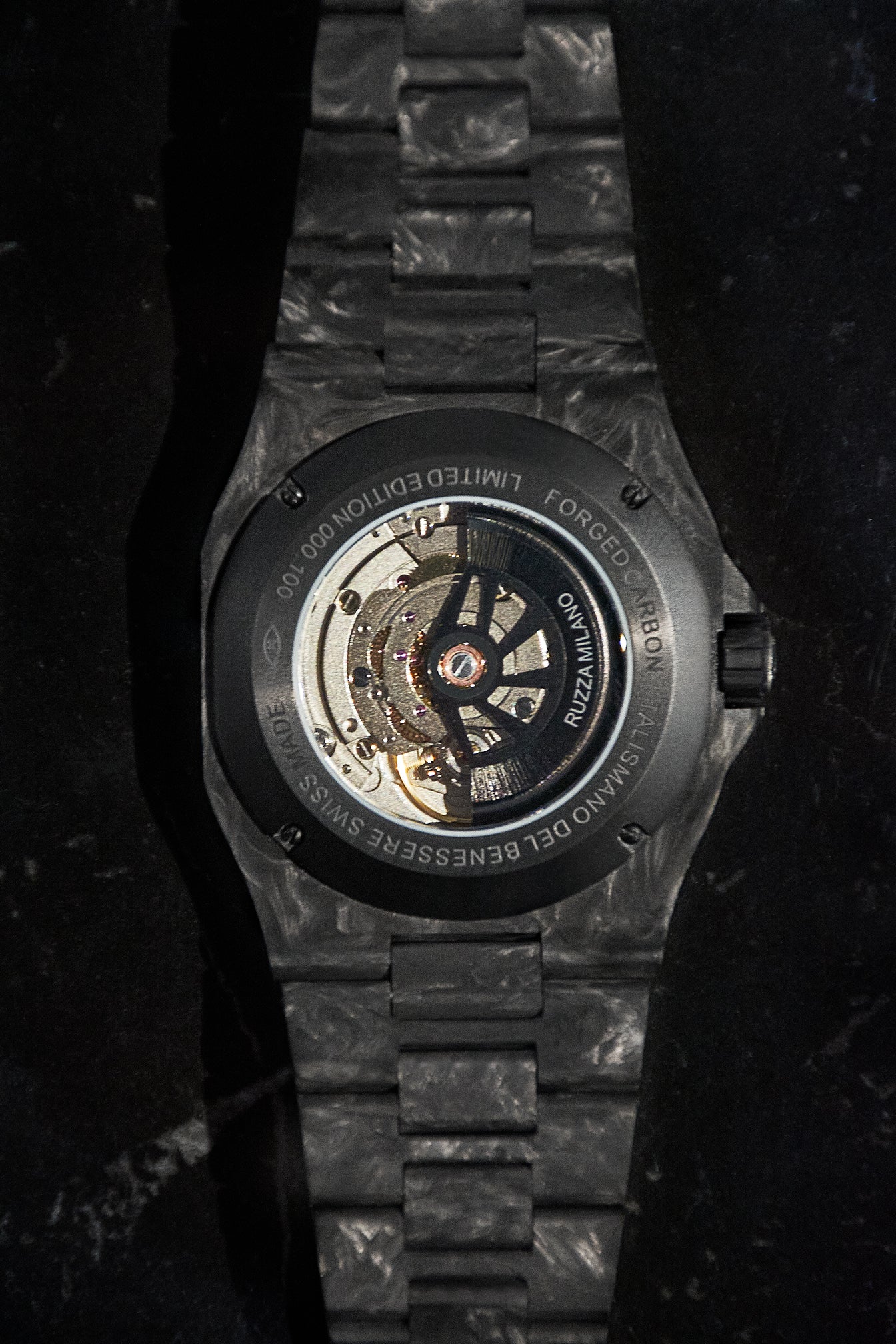 Il retro rivela l’anima meccanica attraverso un fondello in titanio black chiuso con quattro viti e vetro zaffiro trasparente che lascia ammirare il movimento.