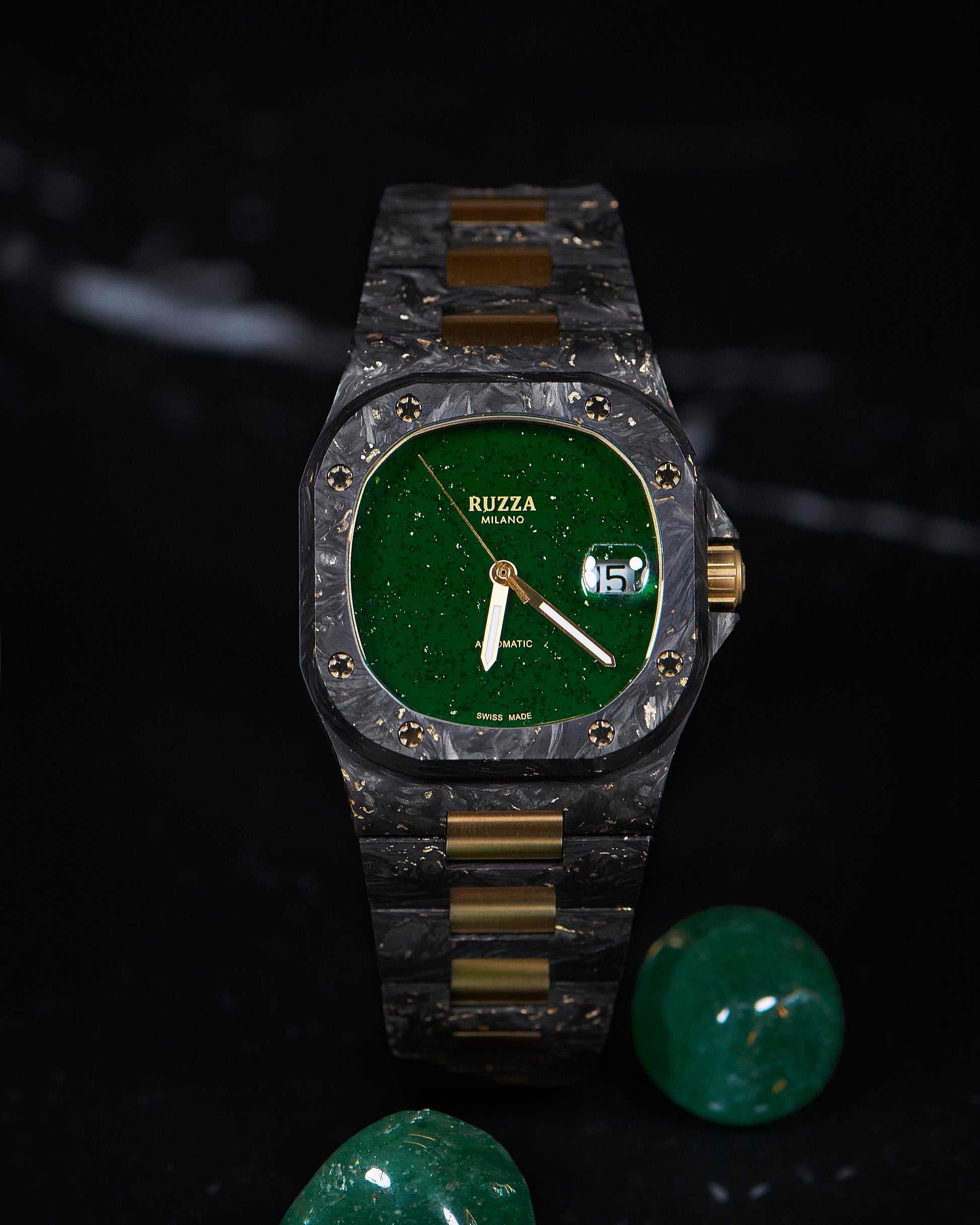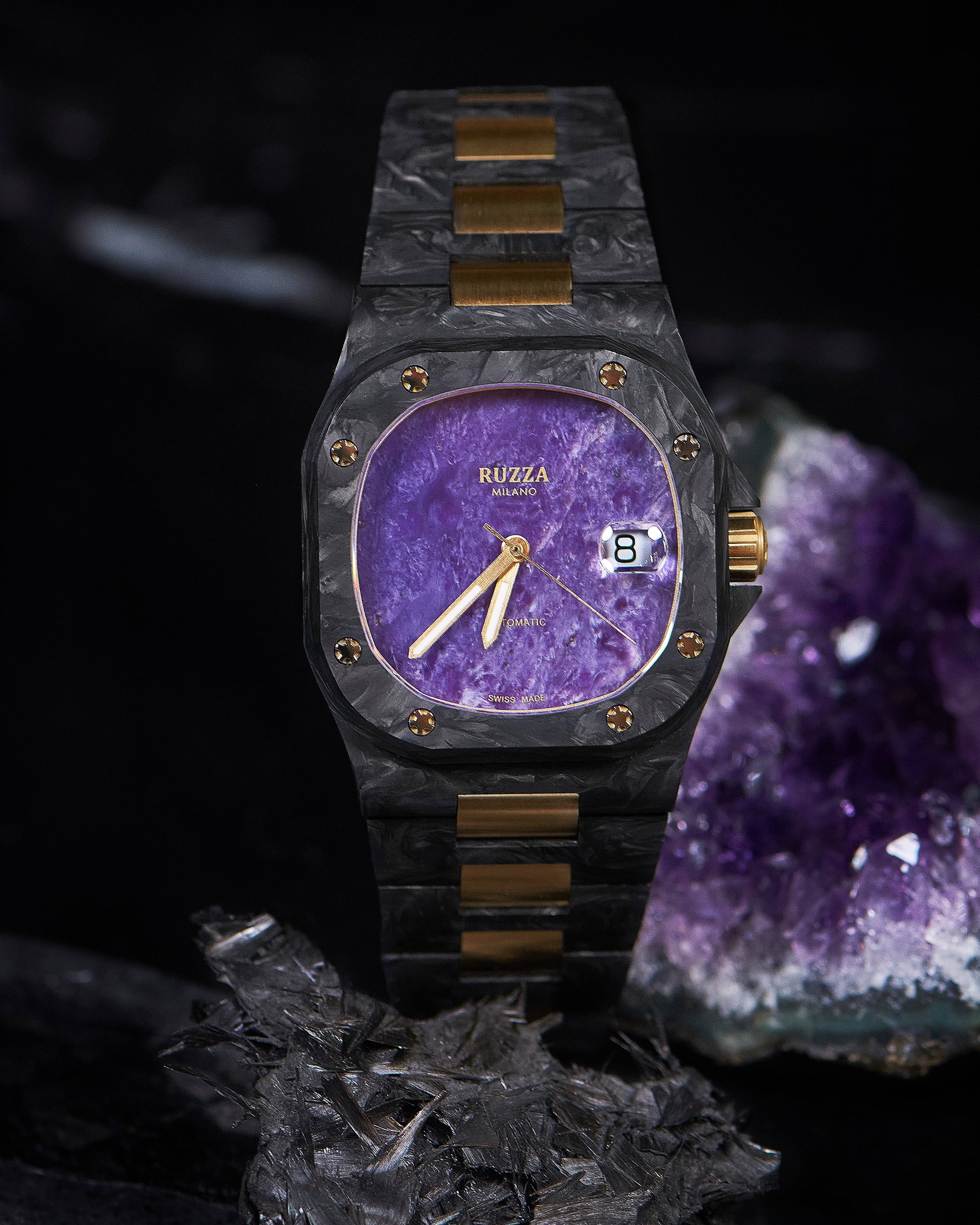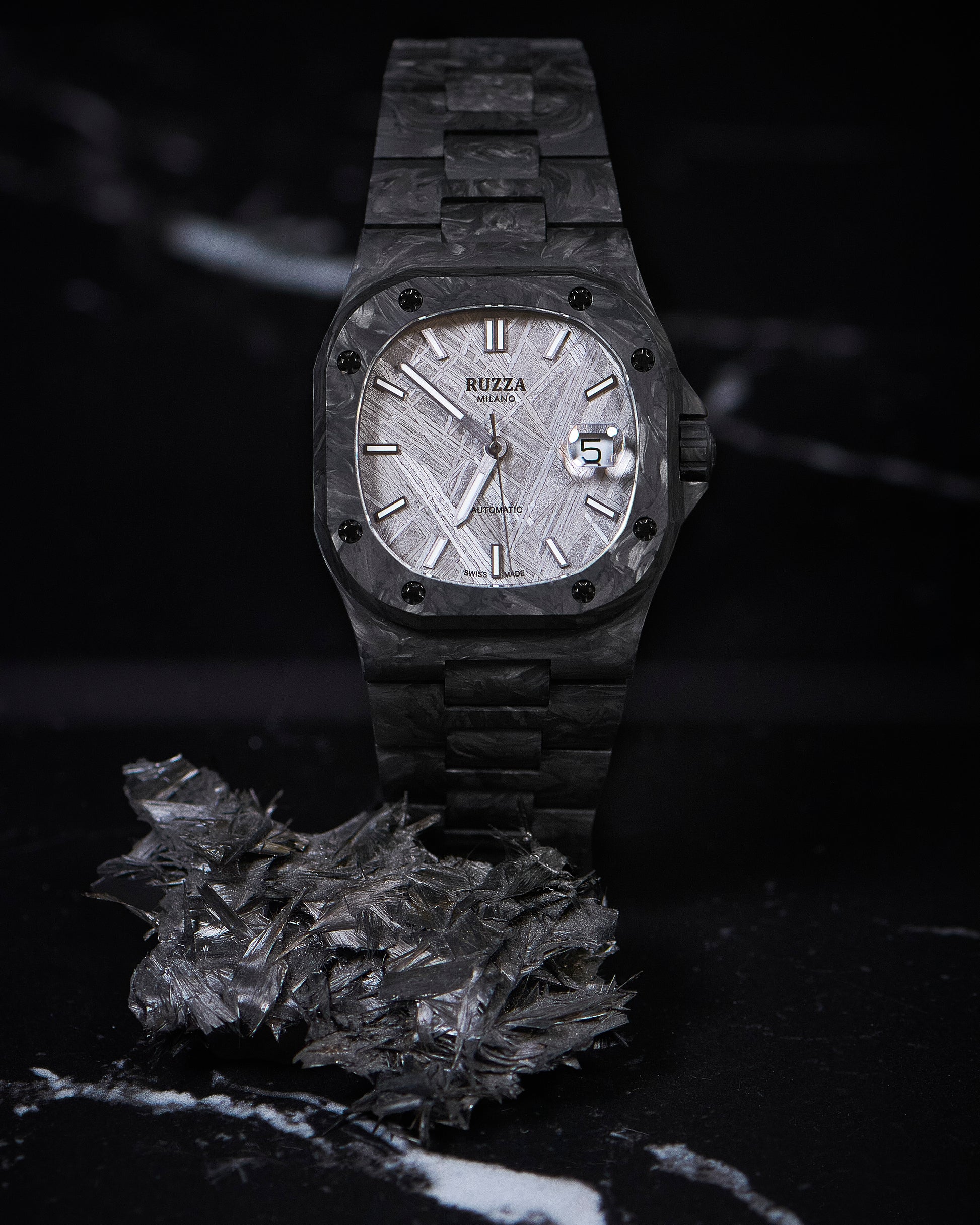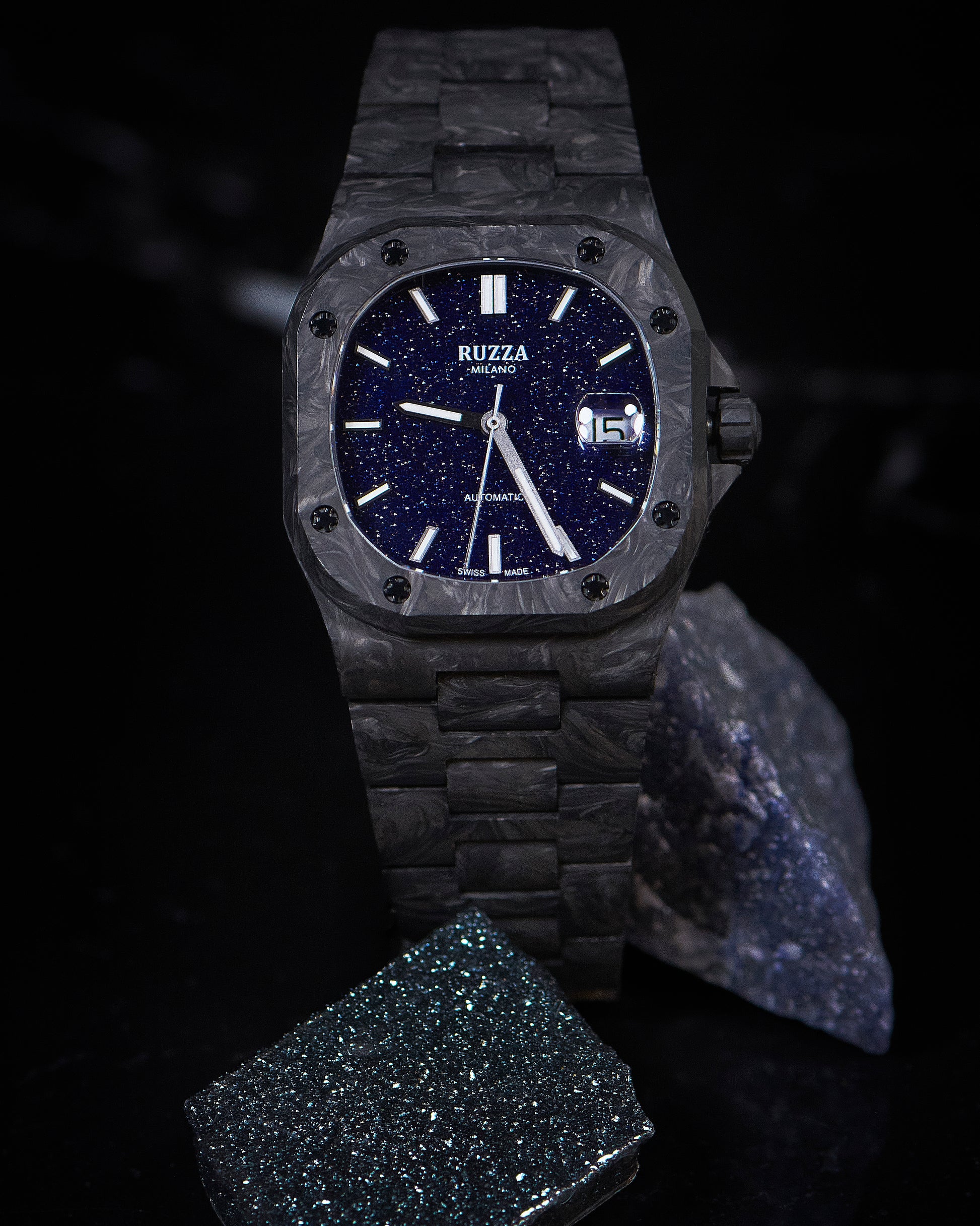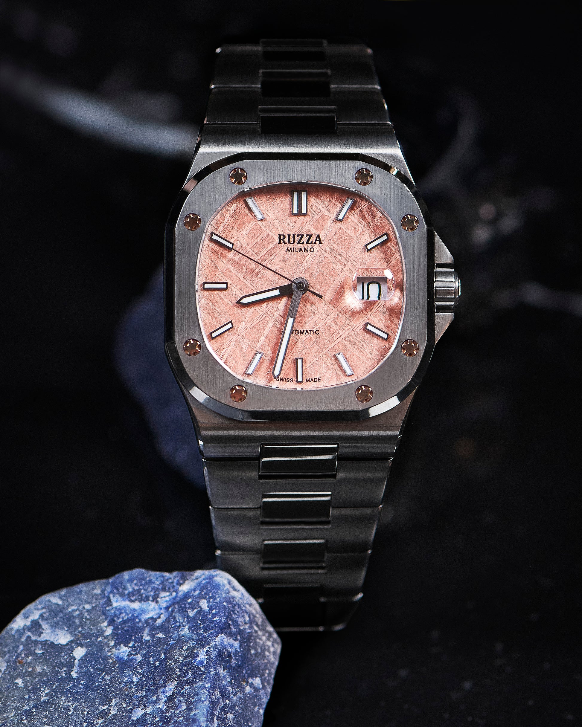 Ogni Ruzza Watch Luxury è un pezzo unico che racchiude frammenti di storia naturale e cosmica. I quadranti in Meteorite presentano pattern geometrici irripetibili nati nello spazio profondo. La versione in Onice Nero vanta Diamanti Naturali VS1 G, scelti per purezza e luce eterna. Completano la collezione pietre vive come l'Onice, il Turchese, l'Avventurina e l'Ossidiana Viola: minerali autentici che offrono una profondità materica e un carattere unico che trascende la semplice estetica.